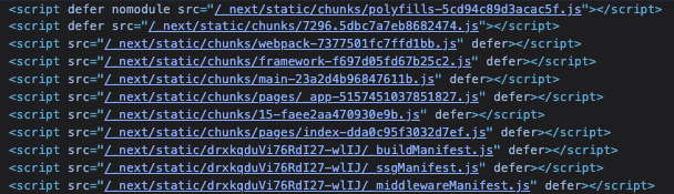 실제로 Nextjs에서는 다음과 같이 nomodule 태그를 사용하여 module 타입을 지원하지 않는 브라우저에 대한 polyfill 번들을 추가로 불러오도록 처리하고 있습니다.