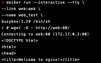 해당 컨테이너를 실행하면 -it옵션을 주었으므로 Terminal에서 해당 애플리케이션에 Input Stream을 전달할 수 있으며, 다음과 같이 wget 리눅스 기본 명령어를 사용해서 web 컨테이너에 요청을 보낼 수 있습니다.