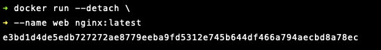 위의 명령어를 실행하면 Unique 한 문자열이 생성되는데, 이는 컨테이너의 Unique Identifier입니다. docker run 명령어를 사용해 컨테이너를 새로 만들 때마다, 이렇게 컨테이너는 Unique 한 ID를 갖게 됩니다. 해당 커맨드가 정상적으로 실행되었음에도 터미널에는 아무런 표시가 없는데, 이는 해당 컨테이너는 '--detach (-d)' 모드로 실행시켰기 때문입니다. detach 모드란 "프로그램이 실행되었지만, Terminal에는 Attach 되지 않았음"을 의미합니다. 대부분의 서버 인스턴스들은 Terminal에서 상호작용하는 것보다, 백그라운드에서 네트워크 통신을 통해 상호작용하는 경우가 많기 때문에 이렇게 detach 모드로 동작하는 경우가 많습니다. 이러한 타입의 프로그램을 daemon이나 service라고 합니다.