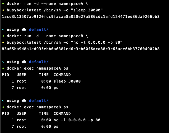 실제로 같은 머신에서 동작하는 두 개의 컨테이너이지만 PID 네임스페이스로 분리되어 있기 때문에 두 개의 컨테이너 모두 PID=1인 프로세스를 가지고 있는 것을 확인할 수 있습니다. 도커는 이렇게 각 컨테이너마다 고유한 PID 네임스페이스를 할당하여 프로세스를 마치 격리된 머신에서 동작되고 있는 것처럼 만들 수 있습니다. (실제로는 Linux namespace, resource limits, filesystem roots, virtualized network components 등을 사용하여 격리를 구현하지만 프로세스의 관점에서는 이렇다는 의미입니다. 그 밖의 다른 내용들은 이후 포스팅에서 차례로 다룰 예정입니다.)