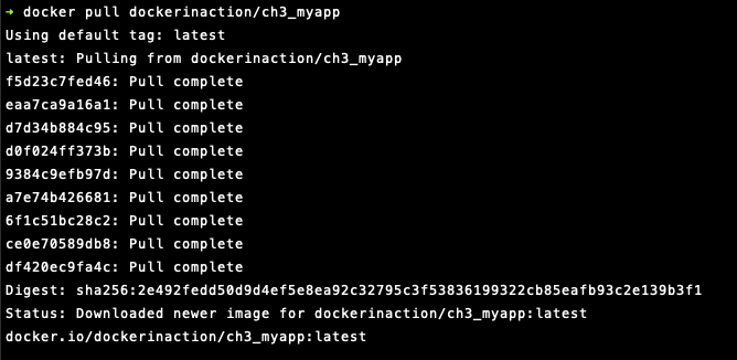 주목할 만한 점은 두 번째 커맨드인 "docker pull dockerinaction/ch3_myotherapp"를 실행했을 때 이미지를 Pull 받는 속도가 훨씬 빠르다는 점이며, 중간중간의 알 수 없는 해시값과 함께 "Already exists"라는 메시지가 보인다는 점입니다. 이 "Already Exists"라는 메시지는 실제로 해당 레이어가 이미 로컬 머신에 존재하고 있기 때문에 원격 레포지토리에서 가져올 필요 없이 캐시를 사용했다는 의미이며, 이 때문에 다운로드 속도도 훨씬 빨라지게 됩니다.