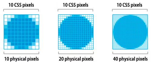 이 PPI는 당연하게도 디바이스마다 상이한 값을 가집니다. 화면 크기가 동일한 iPhone11과 iPhone 11 Pro는 각각 1792-by-828 pixel, 2436-by-1125 pixel을 갖습니다. 따라서 디바이스마다 상이한 "실제 픽셀"값을 기준으로 웹 페이지의 레이아웃을 구성하게 된다면 너무 나 많은 케이스들을 고려해야 하는 문제가 생기게 되는 것입니다. 따라서 Web에서는 CSS Pixel이라는 단위를 설정하여 이를 기준으로 디바이스와의 Pixel 비율을 조정하는 방식을 택합니다. 따라서 Device Pixel : CSS Pixel이 3 : 1인 경우, CSS에서 1px로 잡은 border, width 등의 값들은 실제 디바이스 픽셀 기준으로 3px을 차지하게 되는 것입니다.