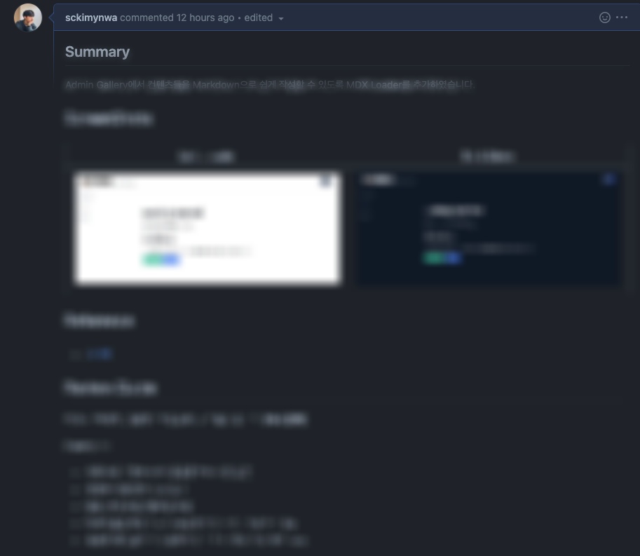 이를 위해 PR Template + 작은 PR의 원칙을 도출해서 작은 PR들을 자주자주 올리고, 리뷰 하는 사람들이 충분히 정보를 제공받을 수 있도록 Summary, Description, ScreenShot, Reference 등을 포함하는 Template 생성을 자동화해두었다. 해당 프로젝트 오너를 지정해서 PR생성 시에 프로젝트 오너에게 자동으로 멘션이 되도록 하는 설정도 마련해두었다.