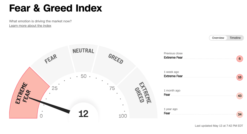최근 개봉한 닥터스트레인지2: 대혼돈의 멀티버스(Multiverse of Madness)를 보면서 최근 대혼돈(Madness)의 모습을 보여주고 있는 시장의 모습이 떠올랐다. 글을 쓰는 지금(5월 14일) Fear and Greed Index는 12(Extreme Fear)를 가리키고 있고, 이는 이번 주 들어 가장 높은 수치가 아니었나 싶다. 불과 하루 전인 5월 13일에 확인한 Fear And Greed Index는 6이었다