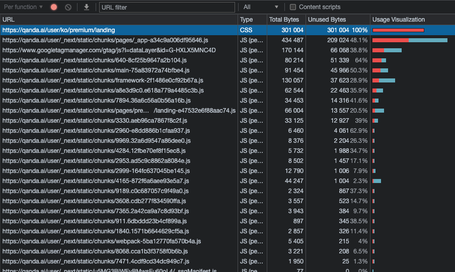 실제로 qanda.ai 페이지의 리소스들을 Coverage Tab에서 살펴본 결과 Usage Visualization이 다음과 같이 나오게 되는데, 대부분의 사용되지 않는 코드들은 Next에서 Font Optimization을 위해 넣은 것이거나, Cross Browsing 대응을 위해 넣은 코드입니다.