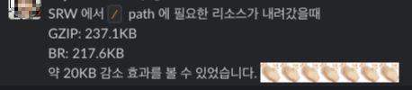 실제로 콴다 프론트엔드 팀에서는 기존에 Nextjs를 사용한 Default Gzip Compression을 제거하고 CF에서 해당 객체를 브라우저에서 지원하는 경우 더 성능이 좋은 BR 알고리즘을 사용해서 압축하도록 변경하였고, 그 결과 Brotli 알고리즘을 지원하는 브라우저에서는 전송되는 번들 사이즈가 10%가량(20KB) 감소되는 효과를 얻을 수 있었습니다.