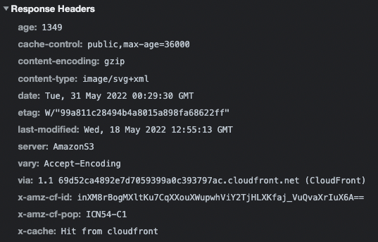 데이터 압축의 경우 오리진 서버나 CDN에서 브라우저의 "Accept-Encoding" 헤더를 보고 압축할지 말지를 결정해서 내려주면 브라우저에서 이를 전달받아 압축 해제해서 사용합니다. Nextjs를 사용하면 기본적으로(Opt-In) 빌드시에 정적인 Asset들과 Content 파일들에 대해서 "gzip" 압축을 수행합니다. 따라서 아래와 같이 정적 데이터(아래의 예시는 svg image)를 가져올 때 "Content-Encoding"이 "gzip"으로 압축되어 내려오는 것을 확인할 수 있습니다.