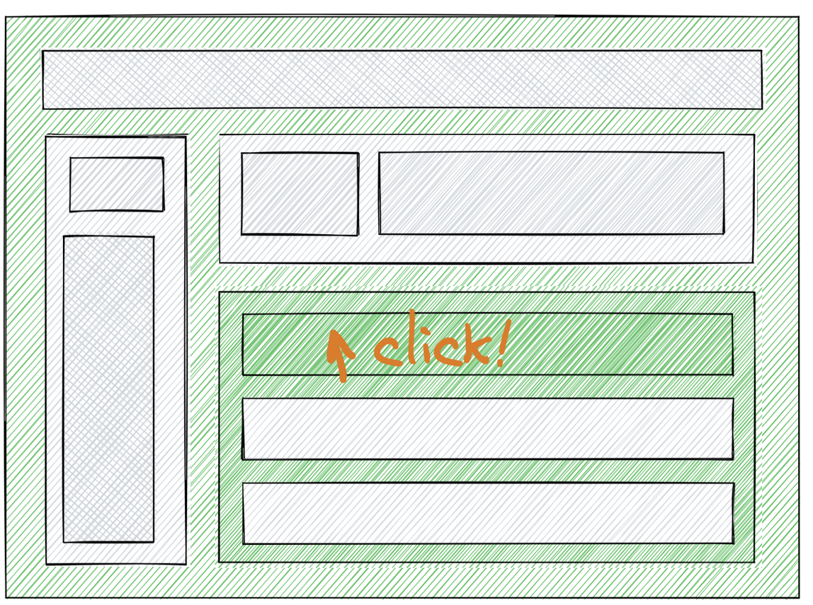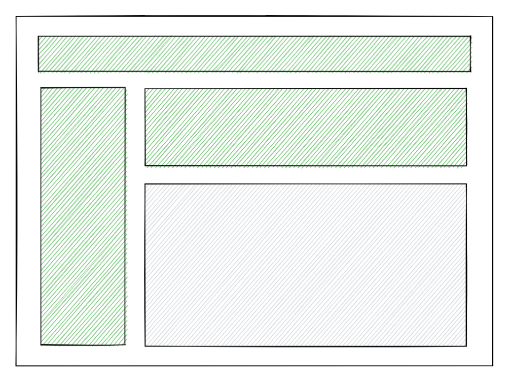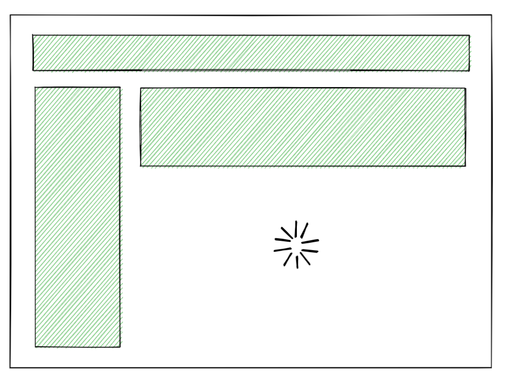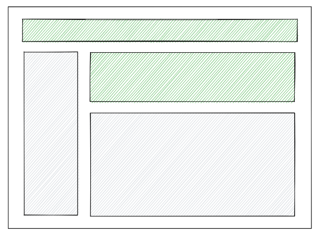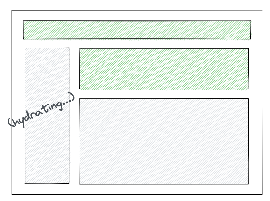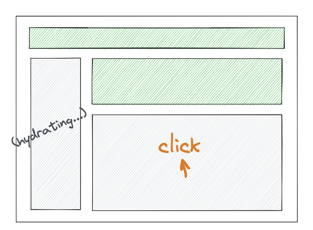 유저가 애플리케이션을 로드했을 때, 우리는 가능한 한 빠르게 fully-interactive 한 페이지를 보여주고 싶을 것입니다. 아래 일러스트레이션에서 초록색으로 칠해진 영역은 페이지 상에서 상호작용이 가능하다(interactive)는 것을 나타냅니다. 다른 말로 하면, 해당 영역에 Javascript 이벤트 핸들러가 붙어있는 상태이고, 버튼을 눌렀을 때, 상태를 업데이트하는 등의 Reactive 한 동작들을 수행할 수 있다는 것을 의미합니다.