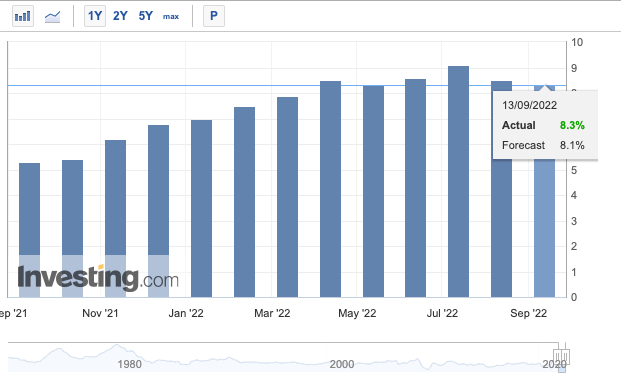 8월 발표된 전년대비 소비자물가 지수(CPI)는 8.3%로 지난달 8.5% 보다 감소했지만, 예상치였던 8.1%를 상회했으며 파월 의장은 확실한 인플레이션 둔화 시그널을 보기 위해서는 CPI뿐만 아니라 근원소비자물가지수(PCE)를 같이 봐야 한다고 이야기했다. 석유 등의 원자재 / 에너지 자원을 뺀 근원 물가지수는 지난달 4.6%보다 오히려 상승한 6.3%를 기록했으며 이는 한 달 동안 유가가 하락하여 공급 사이드에서의 하방 압력이 가해졌음에도 불구하고 물가가 그만큼 내려오지 않았다는 것을 의미한다.