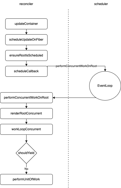 Reconciler에서 update 해야 하는 이벤트를 하나 받으면 performConcurrentWorkOnRoot라는 함수를 scheduleCallback이라는 함수를 통해 Scheduler로 넘기게 됩니다. Scheduler는 이 scheduleCallback이라는 함수를 실행하면서 performConcurrentWorkOnRoot를 callback으로 하는 task를 만들고 이를 taskQueue에 밀어 넣습니다. 그리고 requestHostCallback에 flushWork라는 함수를 macroTask로 밀어 넣으면서 이 flushWork라는 함수가 EventLoop에 의해 스케줄 되어 호출될 수 있도록 합니다.