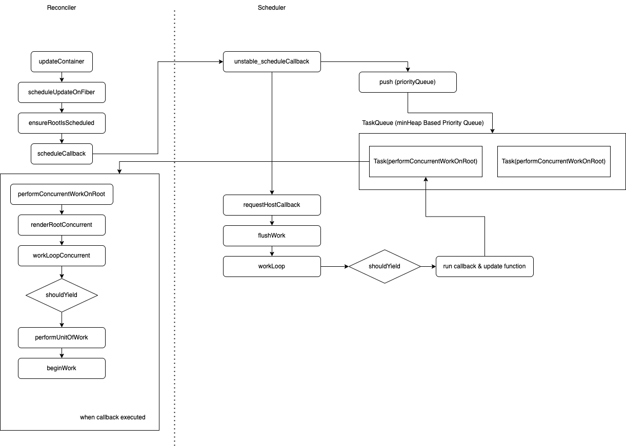 Reconciler에서 update 해야 하는 이벤트를 하나 받으면 performConcurrentWorkOnRoot라는 함수를 scheduleCallback이라는 함수를 통해 Scheduler로 넘기게 됩니다. Scheduler는 이 scheduleCallback이라는 함수를 실행하면서 performConcurrentWorkOnRoot를 callback으로 하는 task를 만들고 이를 taskQueue에 밀어 넣습니다. 그리고 requestHostCallback에 flushWork라는 함수를 macroTask로 밀어 넣으면서 이 flushWork라는 함수가 EventLoop에 의해 스케줄 되어 호출될 수 있도록 합니다.