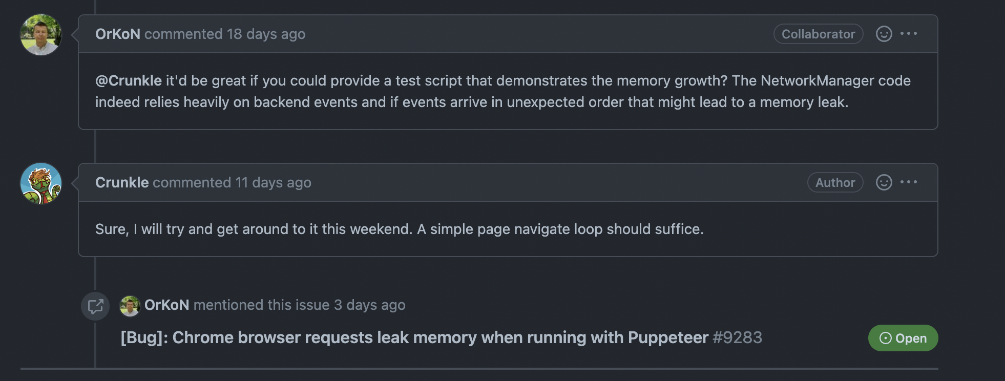 지금 겪고 있는 이유가 정확히 이 이슈와 매칭되는지는 조금 더 확인해 보아야겠지만, 확실한 건 Puppeteer / Chromium에서 비슷한 이유로서의 Memory Leak가 자주 발생했기 때문에, 지금 겪고 있는 문제 또한 Puppeteer / Chromium에서 발생한 이슈일 가능성이 있으며, 이 문제를 빠르게 해결하기 위해서는 조금 다른 방향에서의 접근방법이 필요하다는 것입니다. (지금 당장 Chromium에 Contribute 할 수는 없을 것 같았기 때문이기도 합니다)