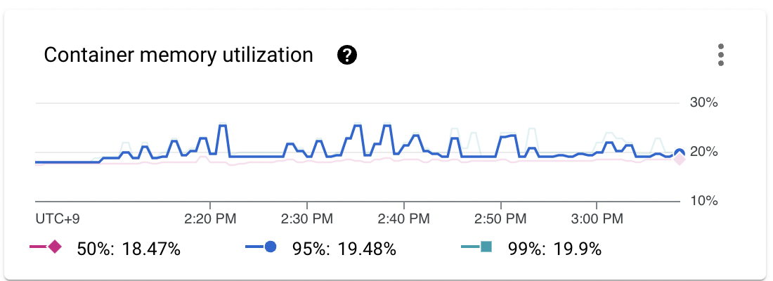 위와 같이 Application Code를 수정한 뒤에, 다시 Dev 환경에 배포해서 수만개의 요청을 처리하도록 했더니 다음과 같이 Memory Leak가 더 이상 발생하지 않고(정확하게는 문제 되지 않을 정도로 발생하다가 특정 시점마다 모조리 수거되는 것입니다.) 20% 선의 Memory Utilization을 보여주는 것을 확인할 수 있습니다.