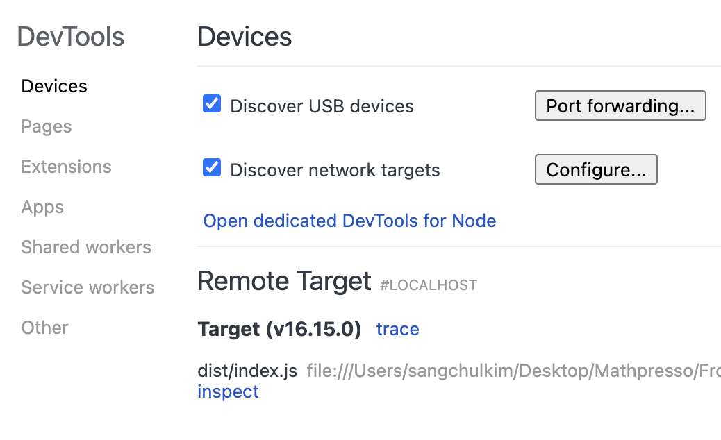 Memory Leak이 발생하는 것을 확인한 후, 이를 해결하기 위해 node의 공식문서에서 가이드하고 있는 대로 inspect 옵션을 두고 Heap Snapshot을 찍어보기로 했습니다. node application을 실행할 때 위와 같이 "--inspect" 옵션을 주면 chrome://inspect 탭에서 해당 노드 서버의 콘솔과 메모리, 네트워크 정보를 크롬 디버깅 툴을 사용해서 확인할 수 있습니다.