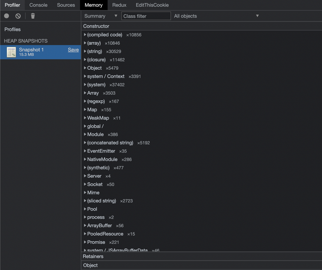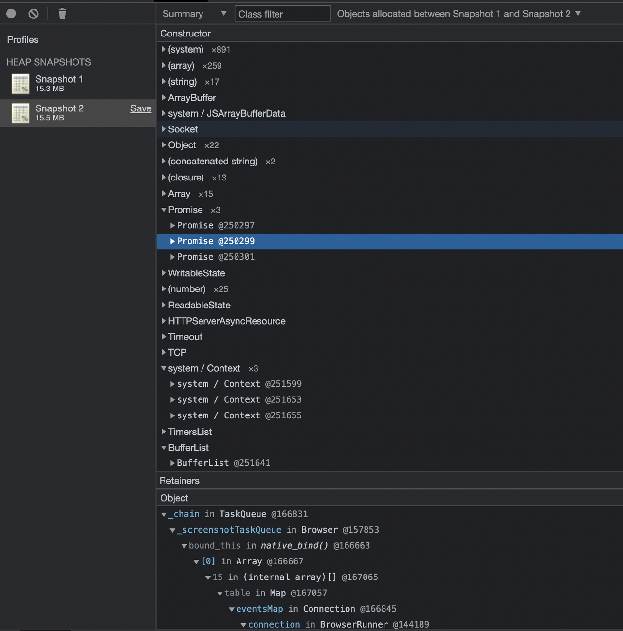 아래 사진은 node application이 처음 실행되었을 때의 Heap Snapshot(15.3MB)이며, 그 다음 사진은 node application이 3번의 이미지 생성 요청을 수행하고, 사진 왼쪽 상단의 Trash Icon을 눌러서 Force Garbage Collection을 수행한 뒤의 Heap Snapshot(15.5MB)입니다. 두 Snapshot 사이에는 이미 요청이 끝나서 Response(png)가 클라이언트에게 반환되었음에도 불구하고, screenshotTaskQueue와 같은 Promise, Socket 등의 정보가 아직 남아있는 것을 발견할 수 있습니다. 기대대로라면 요청이 끝난 후 메모리에서 제거되어야 하는 리소스들이 제거되지 않고 Heap에 남아 있고, 이들이 수만 건의 요청을 처리하면서 누적되어 Memory Leak을 발생시켜, Service Unavailable 상태를 만들게 된 것입니다.