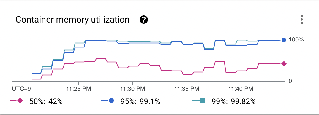 처음에는 요청을 잘 처리하는가 싶더니 수천개의 요청을 처리한 이후, 이내 이어지는 요청들이 모조리 실패하면서 계속해서 Connection Timeout에러가 발생하는 상황이 생겼습니다. 문제를 확인하기 위해 GCP상의 여러 지표들을 확인해보니 아래와 같이 memory 사용량이 시간이 지남에 따라 계단형으로 증가하면서 100%를 초과하고 있었고, 이에 따라 이후의 요청들이 계속 실패하고 있었음을 확인할 수 있었습니다. Memory Leak이 발생한 것입니다.