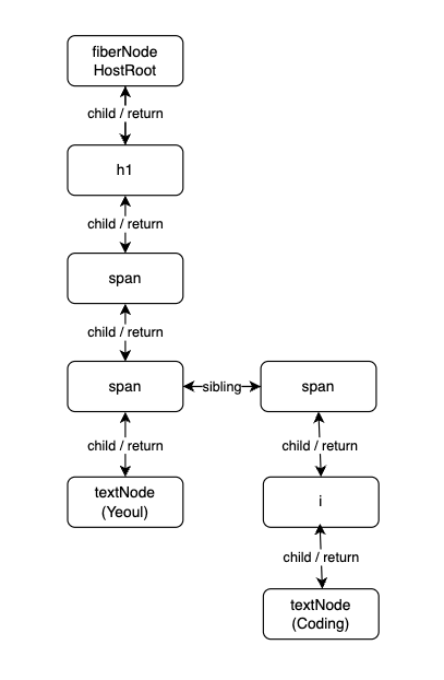 - h1노드가 처리되고 다음 next에 할당되는 값은 span입니다. 위와 동일한 순서대로 span을 처리하고 그다음 span을 처리하고 마지막 "Yeoul"이 담겨있는 TextNode까지 처리하고 나면 next = null이 되고 completeUnitOfWork가 호출됩니다.