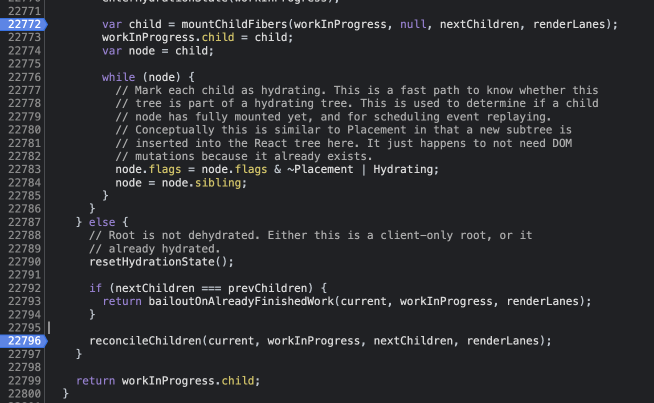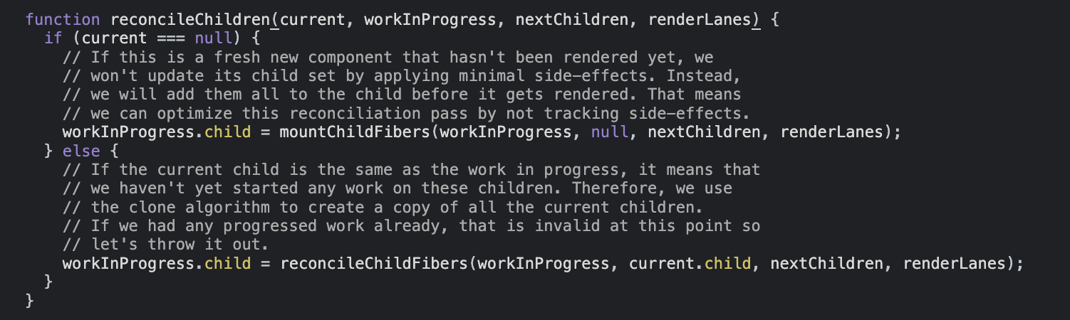 updateHostRoot 함수에서는 넘어온 workInProgress Fiber Node에 대해 reconcileChildren을 호출해서 각 Children에 대한 FiberNode를 생성하게 됩니다. 이미 FiberNode가 있으면 reconcileChildFibers가, 아직 생성되지 않았으면 mountChildFibers가 호출됩니다.