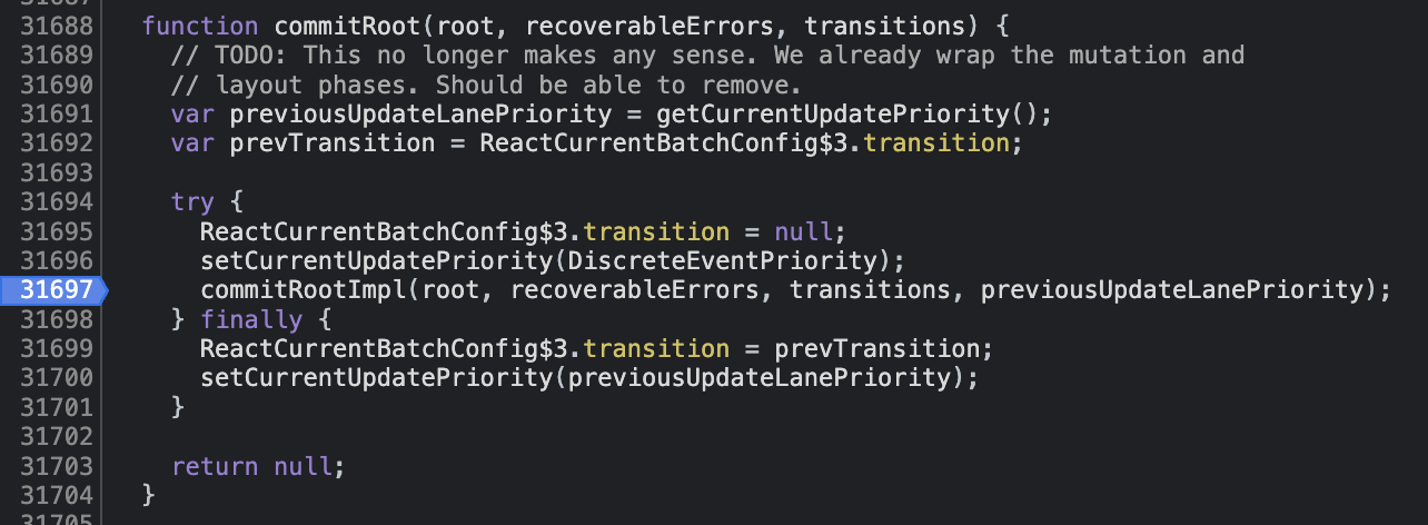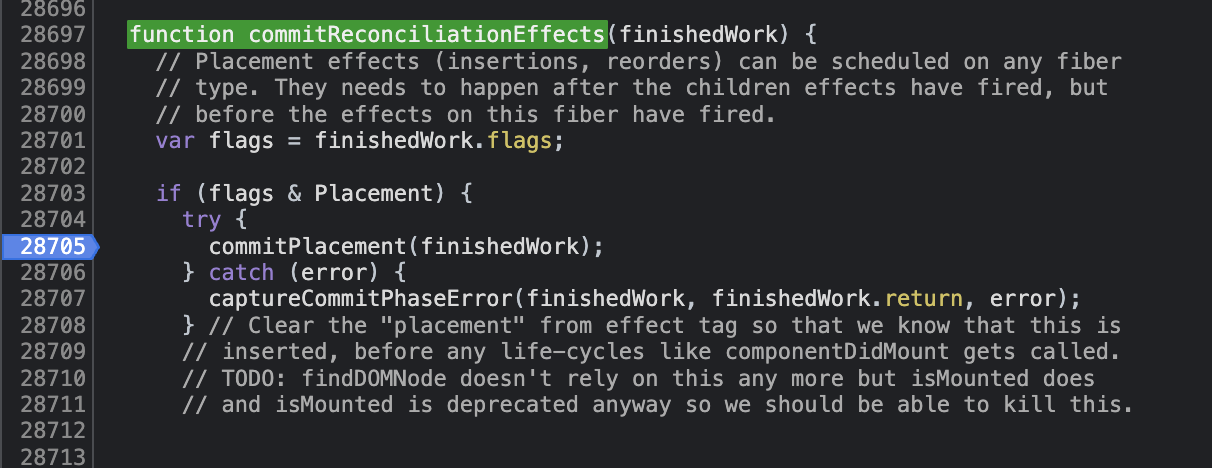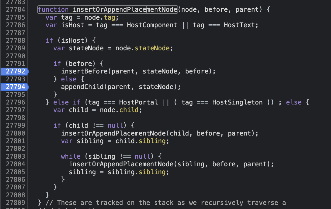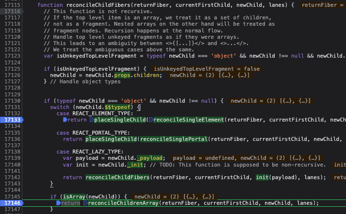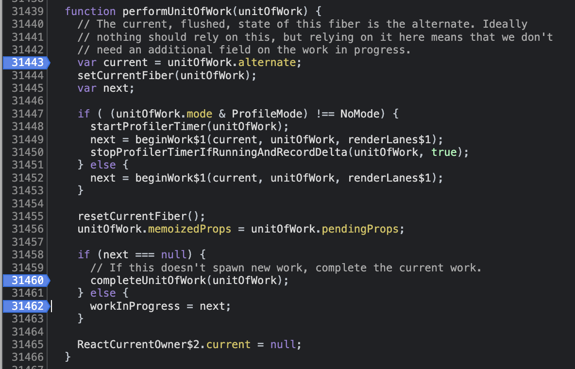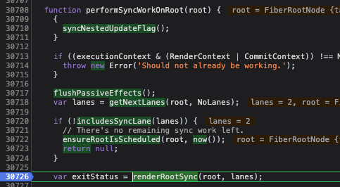 이제 여기에 각종 break point를 걸어가면서 React가 화면을 렌더 하는 동안 어떤 과정들을 거치는지를 알아보도록 하겠습니다. 함수 코드를 따라가다 보면 수많은 Detail과 조건문, 용어들이 나오지만 이번 포스팅에서는 sync mode에서의 initialMount를 설명하기 위해 필요한 부분만 따라가도록 하겠습니다. (거치지 않는 분기와 에러 처리, effect를 처리하는 부분등에 대한 내용은 다루지 않습니다.)