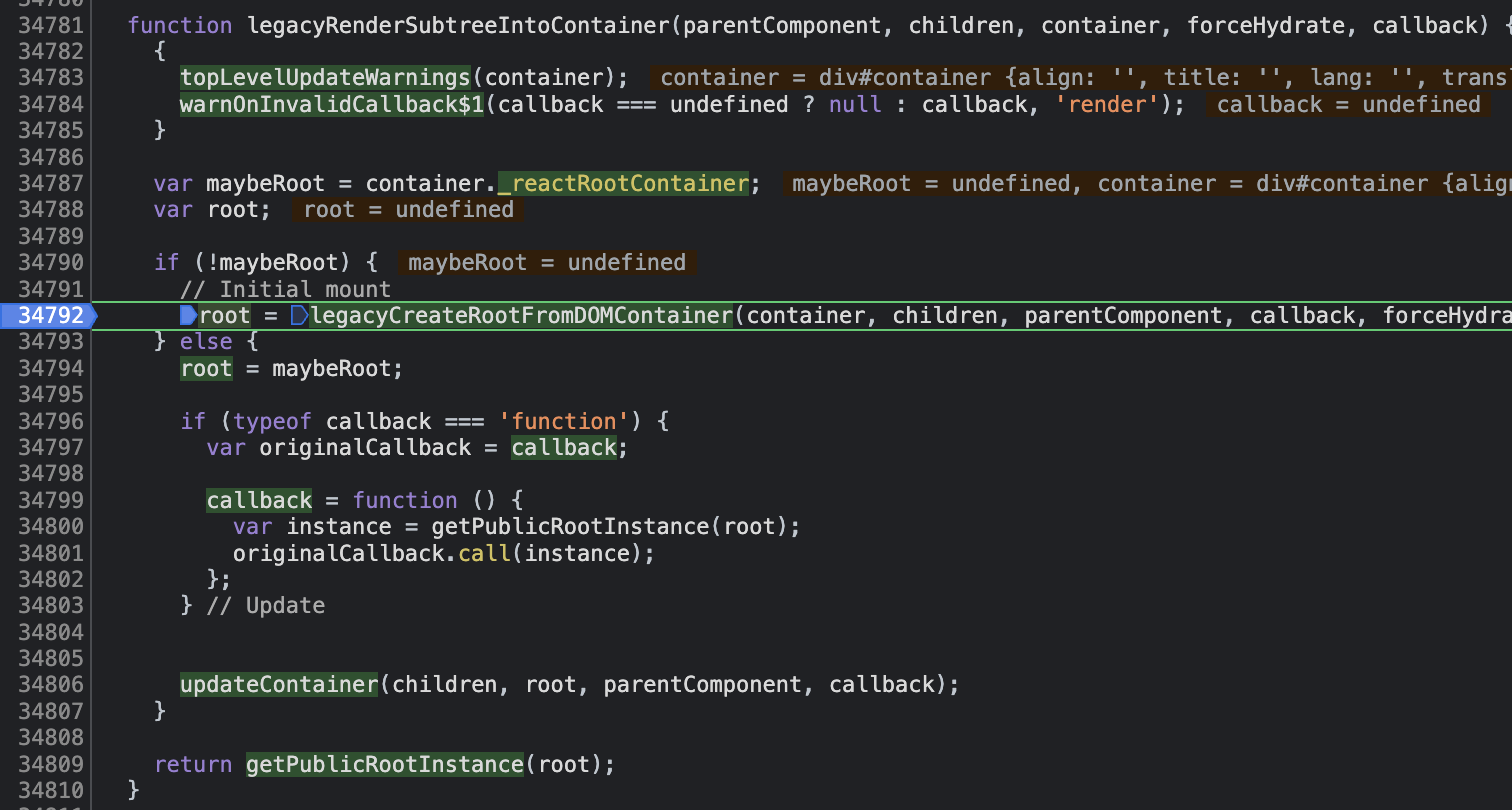 HTML Source Code 상에서도 확인이 가능하듯, 가장 먼저 수행되는 함수는 ReactDOM.render입니다. 여기서는 legacyRenderSubtreeIntoContainer를 호출하고 그 결과를 리턴하는데, 이때 넘겨주는 매개변수는 render호출 시 넘겨준 h1 element와 container(react에서 <div id="container">으로 넘겨주는) element입니다.