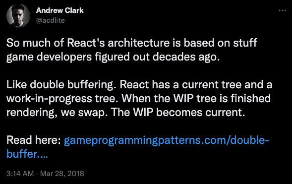 아래에서 살펴볼 React Source Code를 보면, current, workInProgress, alternate와 같은 용어들이 등장합니다. 이는 수십년 전부터 게임 프로그래밍에 사용되던 Double Buffering 개념을 React에 도입한 것인데, 한쪽에서 화면을 보여주는 동안(current) 다른 한쪽에서는 렌더링 작업을 진행하고(workInProgress), 렌더링 작업이 끝나면 서로 alternate로 참조하고 있는 current와 workInProgress를 서로 Switching 하는 방식으로 동작하는 것을 의미합니다. 따라서 코드를 살펴보다가 current, workInProgress, alternate와 같은 참조들이 등장한다면 "이는 위의 Double Buffering Mode를 위한 것이고, 실제 렌더링 작업은 workInProgress에서 진행한 뒤에, 작업이 끝나면 이를 alternate참조를 통해 current로 변경하는구나"라고 이해하면 됩니다. (current, workInprogress는 모두 FiberNode를 가리킵니다.)