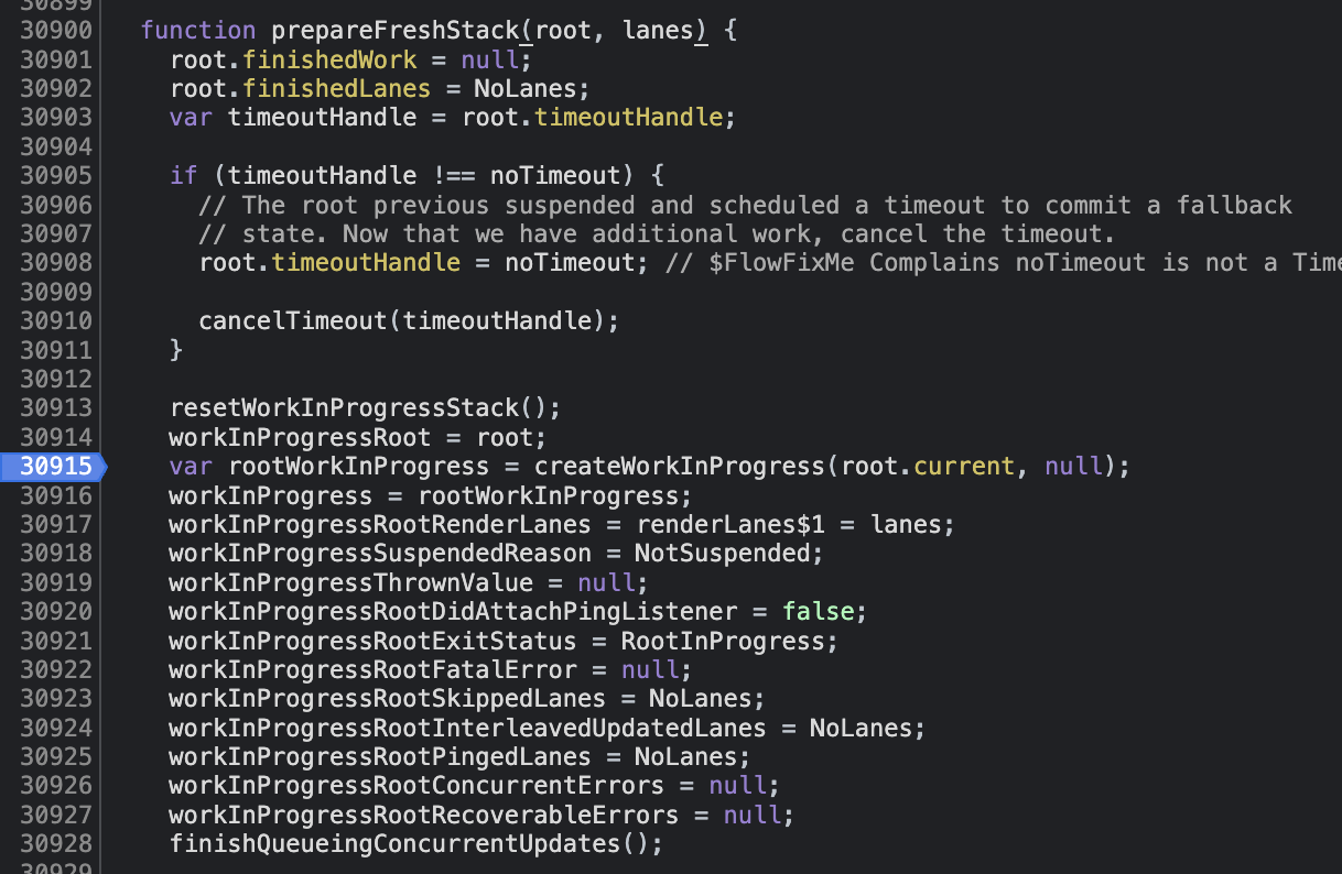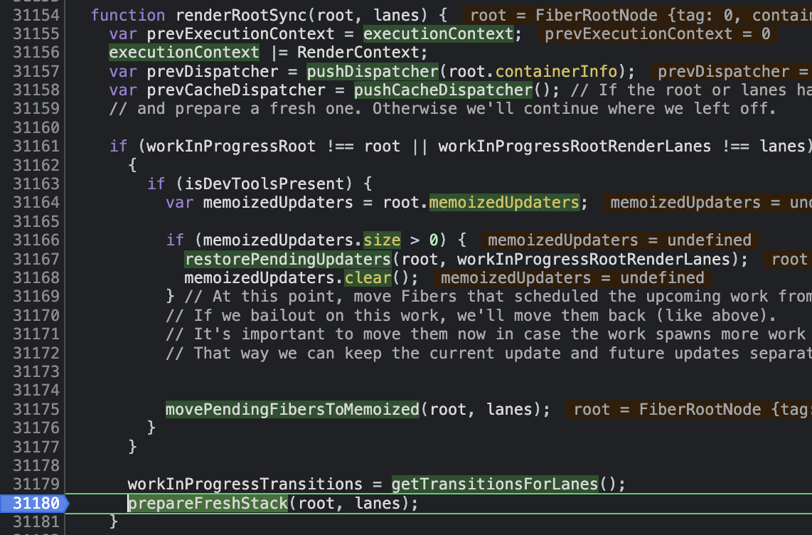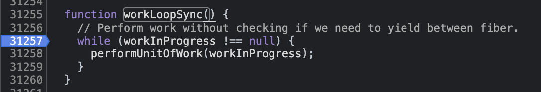 이렇게 FiberRootNode에 대해서 workInProgress가 생성된 이후에는 renderRootSync로 돌아와 workLoopSync를 호출하여 workInProgress fiber에 대한 작업을 시작하게 됩니다.