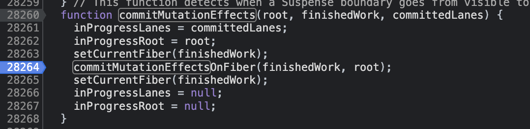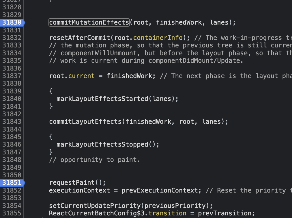 performSyncWorkOnRoot에서 renderRootSync 함수의 호출이 끝나고 Fiber Tree 구조가 완성되면 이어서 commitRoot를 호출합니다. 이후 commitRoot -> commitRootimpl -> commitMutationEffects -> commitMutationEffectsOnFiber -> commitReconcilationEffects -> commitPlacement -> insertOrAppendPlacementNode -> appendNode의 흐름을 거쳐 DOM Node에 최종적으로 반영됩니다. 정확히는 commitMutationEffects 호출이 완료되었을 때, requestPaint() 호출을 통해 브라우저에게 paint를 요청함으로써 화면에 DOM Node를 그리게 됩니다.