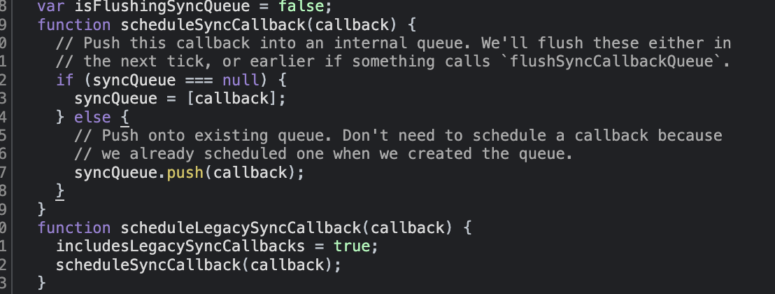 scheduleUpdateOnFiber는 동작이 조금 독특한데, 우선 실제로 React가 Fiber 단위로 렌더 작업을 수행하기 위한 엔트리포인트인 performSyncWorkOnRoot를 scheduleLegacySyncCallback이라는 함수를 통해 스케줄 합니다. 즉, 렌더링 작업은 performSyncWorkOnRoot가 호출되면서부터 시작되며, 이 함수를 호출하기 위한 스케줄링을 scheduleLegacySyncCallback을 통해 진행한다는 의미입니다. 바로 아래에 scheduleMicrotask와 flushSyncCallbacks 함수가 있음을 유의하면서 이 scheduleLegacySyncCallback 함수를 살펴보도록 하겠습니다.