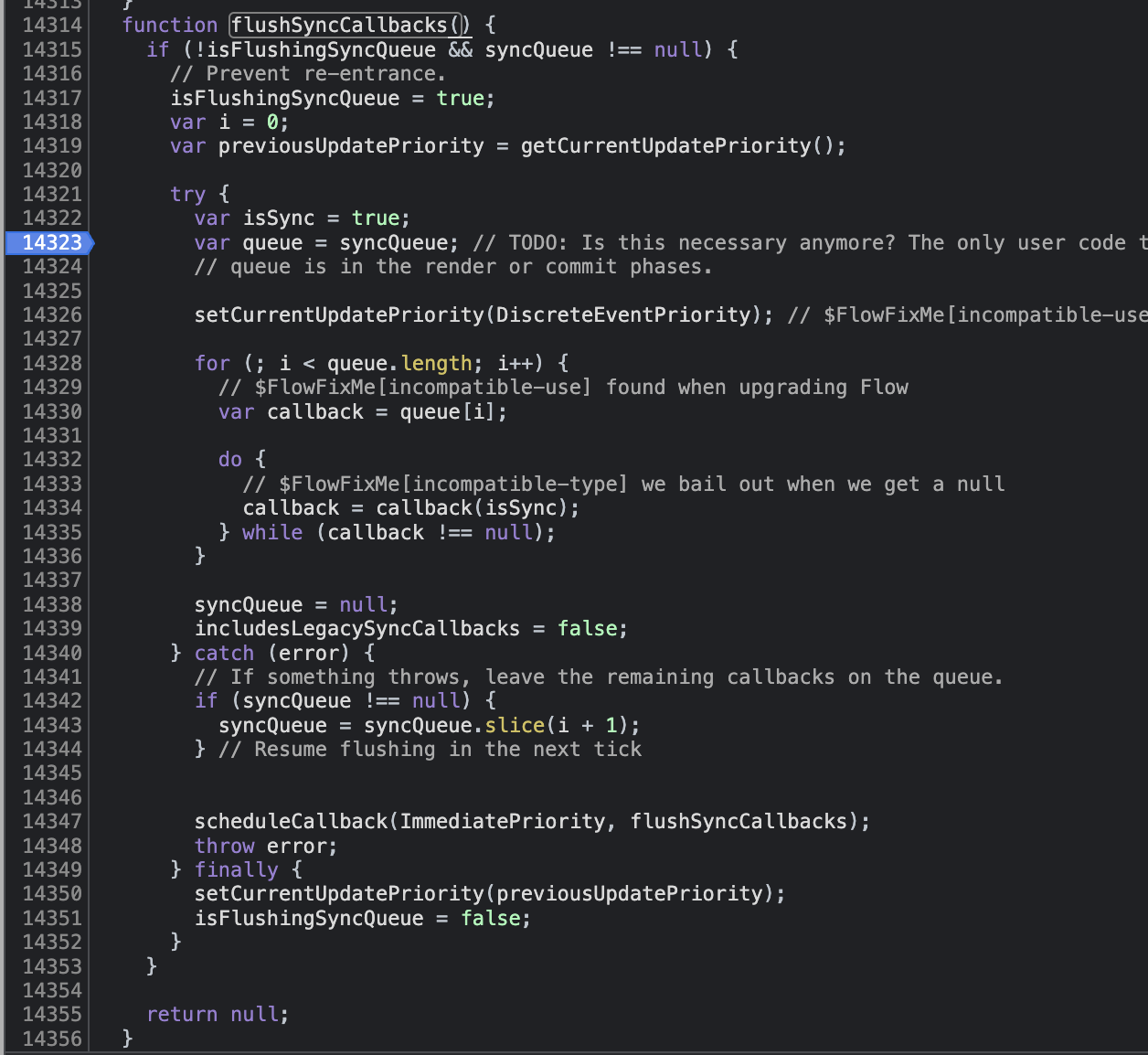 scheduleUpdateOnFiber의 호출이 끝난 뒤, 브라우저가 microtask를 처리하는 시점에 이 flushSyncCallbacks 함수가 불리게 되며 이 함수는 아래와 같이 callback을 실행하고 종료합니다. 바로 이 시점에 렌더링을 처리하는 performSyncWorkOnRoot 함수가 호출되는 것입니다.
