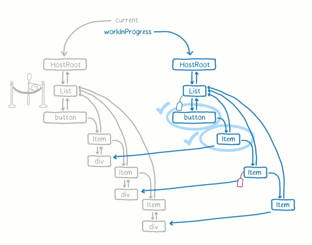 renderRootSync에서는 이 글의 제일 위에서 살펴보았던 Double Buffering 구조를 만들기 위해 current Fiber Node의 alternate인 workInProgress Node를 생성하는 함수인 prepareFreshStack을 호출하게 됩니다. prepareFreshStack에서는 createWorkInProgress를 호출하여 FiberRootNode의 workInProgress Node를 생성합니다. 생성 후, root의 current.alternate는 workInProgress로, workInProgress.alternate는 current의 매핑을 만들어주어 아래와 같은 Double Buffering 구조를 만들어 줍니다.