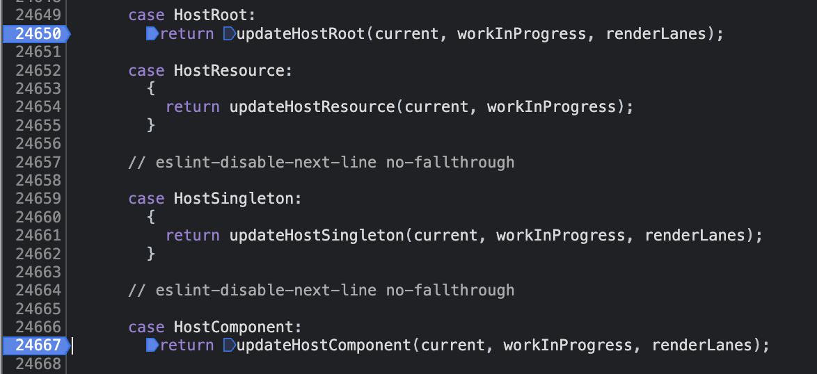 beginWork에서는 넘어온 workInProgress Node의 tag를 보고 HostRoot / HostComponent 등의 타입을 판단합니다. 가장 처음에 넘어오는 workInProgress는 FiberRootNode이기 때문에 HostRoot 타입에 걸리게 되고, 다음(h1)부터는 하위 Element인 HostComponent에 걸리게 됩니다.