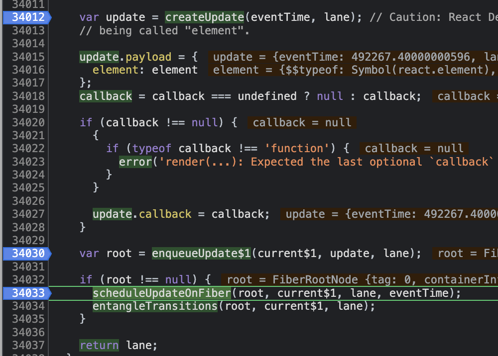 updateContainer에서는 해당 RootFiberNode를 스케줄 하기 위해 scheduleUpdateOnFiber를 호출합니다. (위에 createUpdate, enqueueUpdate 관련된 내용이 있는데, 이 부분은 Lane에 관한 것으로, SyncMode에서는 크게 상관이 없으므로 이번 포스팅에서는 넘어가도록 하겠습니다.)