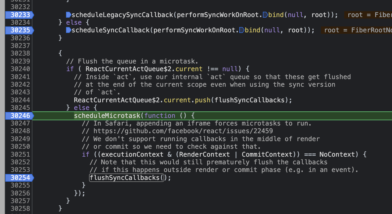 위에 scheduleUpdateOnFiber를 다루면서 scheduleMicrotask와 flushSyncCallbacks를 유의해야 한다고 언급했었는데, 바로 이 부분이 이 syncQueue에 들어있는 callback을 처리하는 부분입니다. scheduleUpdateOnFiber는 scheduleLegacySyncCallback함수를 호출해서 syncQueue에 performSyncWorkOnRoot를 callback으로 push 한 뒤에 flushSyncCallbacks라는 함수를 microtask에 스케줄 합니다. 이는 말 그대로 flushSyncCallbacks라는 함수를 microtask로 등록한 뒤에 브라우저의 Event Loop를 사용해서 이를 실행하겠다는 의미입니다.