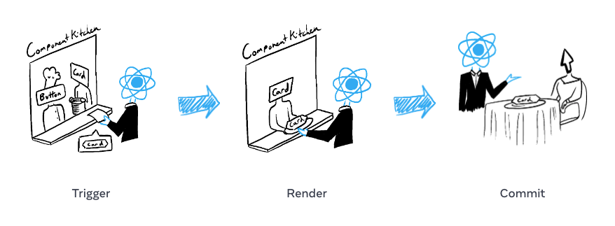 Imagine that your components are cooks in the kitchen, assembling tasty dishes from ingredients. In this scenario, React is the waiter who puts in requests from customers and brings them their orders. This process of requesting and serving UI has three steps: