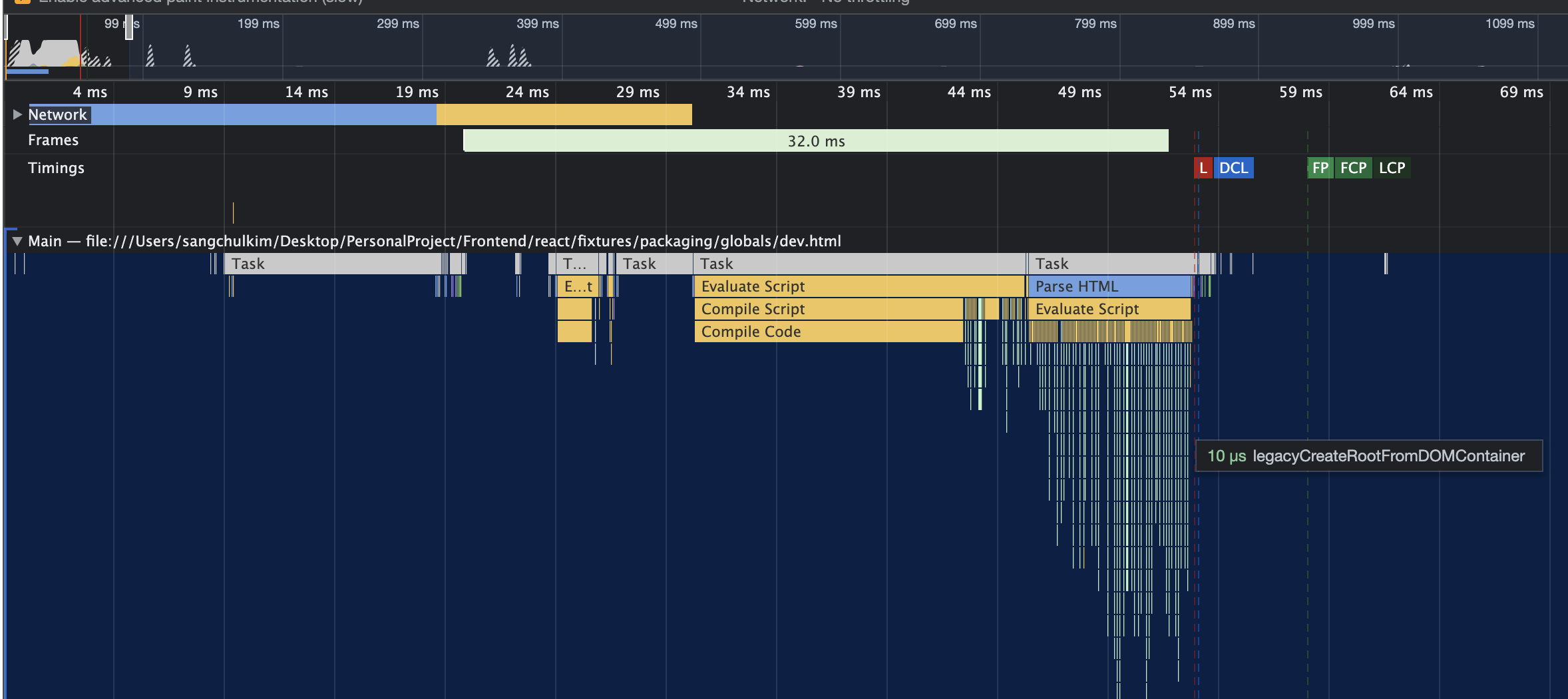 해당 화면을 렌더하고 Performance Recording을 한 뒤 Performance Tab을 살펴보면 다음과 같이 브라우저가 화면을 paint 하기 전에 많은 function call들이 발생하고 있음을 알 수 있습니다. 자세히 살펴보면, render, performUnitOfWork, legacyCreateRootFromDOMContainer 등의 여러 함수 호출들이 연쇄적으로 일어나고, 마지막에 appendChild가 호출되어 DOM을 업데이트하면 브라우저에 이 내용물이 반영되는 흐름인 것을 알 수 있습니다.