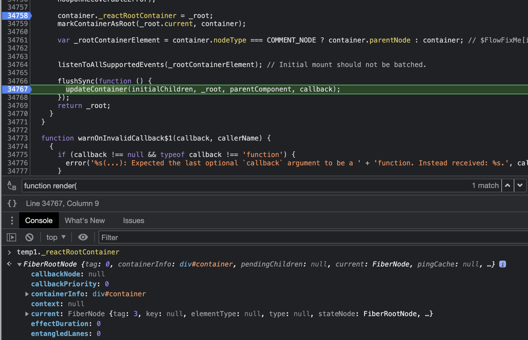 legacyCreateRootFromDOMContainer에서는 위에서 말한 대로 rootFiberNode를 생성합니다. 그리고 container element의 _reactRootContainer property를 선언하고 여기에 이 값을 할당합니다. 이 부분의 코드를 거치게 되면 콘솔에서 container element의 _reactRootContainer property를 조회할 수 있고, 이 값은 FiberRootNode 타입의 객체입니다. 이렇게 container element를 업데이트하고 updateContainer를 호출합니다.