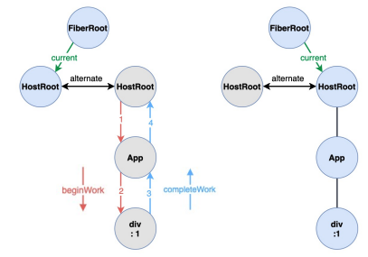 - 처음 performUnitOfWork의 매개변수로 들어가는 workInProgress는 FiberRootNode를 의미합니다. 바로 h1을 처리하는 것이 아닌 FiberRootNode를 먼저 처리하는 점에 주의해야 합니다.