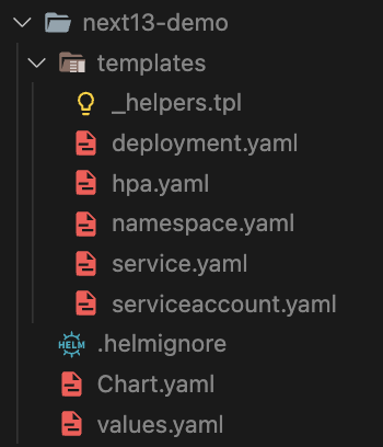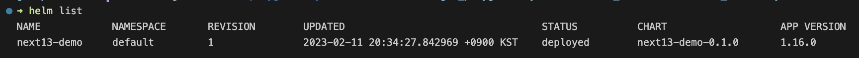 "yarn add react"라는 명령어를 치면 로컬 디렉터리에 react라는 라이브러리가 node_module의 형태로 설치되듯이 "helm install next13-demo next13-demo"라는 명령어를 치면 클러스터에 next13-demo 애플리케이션을 구성하기 위한 service, pod, serviceaccount 등의 리소스들이 설치됩니다.