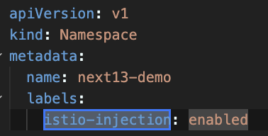 주목할 만한 점은, istio-ingress namespace와 next13-demo namespace에 istio-injection=enabled라는 label이 붙어있는데, 이는 istio에서 이러한 label이 붙어있는 namespace에서 생성되는 pod에 자동으로 istio-proxy container를 주입해 주기 때문입니다. 따라서 위와 같이 istio-system을 클러스터에 설치했다면, 파드가 생성될 namespace에 다음과 같이 label만 붙여주어도 해당 namespace에 있는 파드의 ingress/egress traffic을 istio를 통해 조회할 수 있게 됩니다.
