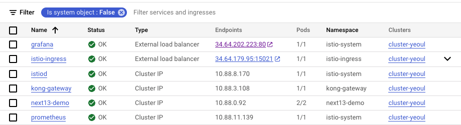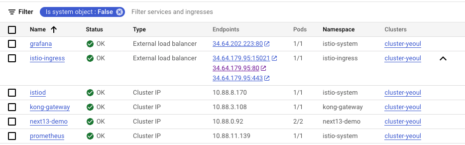 클라이언트는 External LoadBalancer을 통해 외부에 노출된 Istio Ingress Gateway로 요청을 보내게 됩니다. (htpp://34.64.179.95:80) Istio Ingress Gateway는 이 요청을 받아 뒷단의 Kong Gateway로 요청을 흘려보내며, Kong Gateway는 이번 예제에서는 별다른 설정 없이 뒤의 next13-demo 서비스로 트래픽을 흘려줍니다.