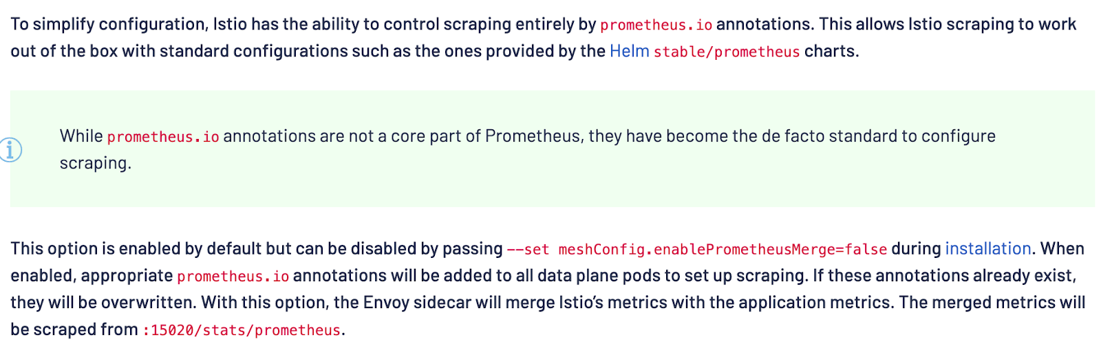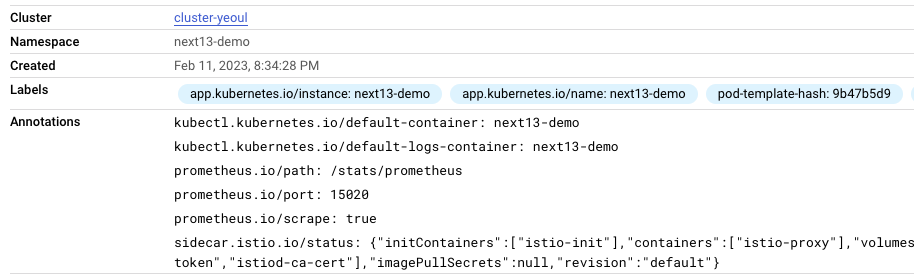 주목할만한 점은 istio와 prometheus 간의 호환성입니다. istio에서는 설정을 단순화하기 위해(To simplify configuration) 프로메테우스와의 호환을 위한 여러 설정들을 default로 켜두었습니다. 따라서 istio를 사용하면 prometheus를 설치하는 것 만으로 istio-proxy의 데이터가 promethues와 연동되며 실제로 next13-demo의 파드 내의 Annotations를 보면 별도의 prometheus 설정을 하지 않았는데도 istio에서 proxy를 주입하면서 prometheus.io와 관련된 여러 annotations들을 추가해 준 것을 확인할 수 있습니다.