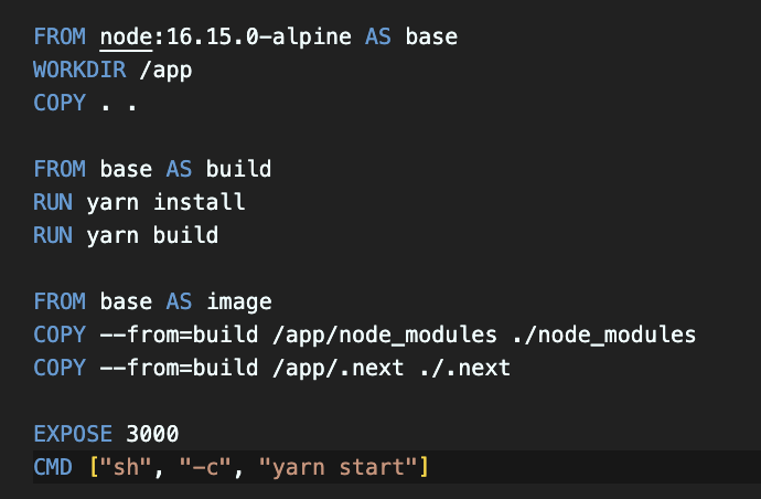 클라우드 환경에서 서비스되는 애플리케이션은 대부분 Image의 형태로 빌드되며, 컨테이너에서 이 이미지를 실행하는 구조를 갖습니다.(App Engine, Cloud Run과 같은 예외 케이스들도 있긴 합니다.) 위의 예제에서도 next13-demo라는 애플리케이션을 빌드하면 아래의 Dockerfile 대로 빌드되어 도커 이미지가 생성되며, Container Registry에 저장된 이 이미지는 실행되어 컨테이너 런타임 환경에서 서비스됩니다.