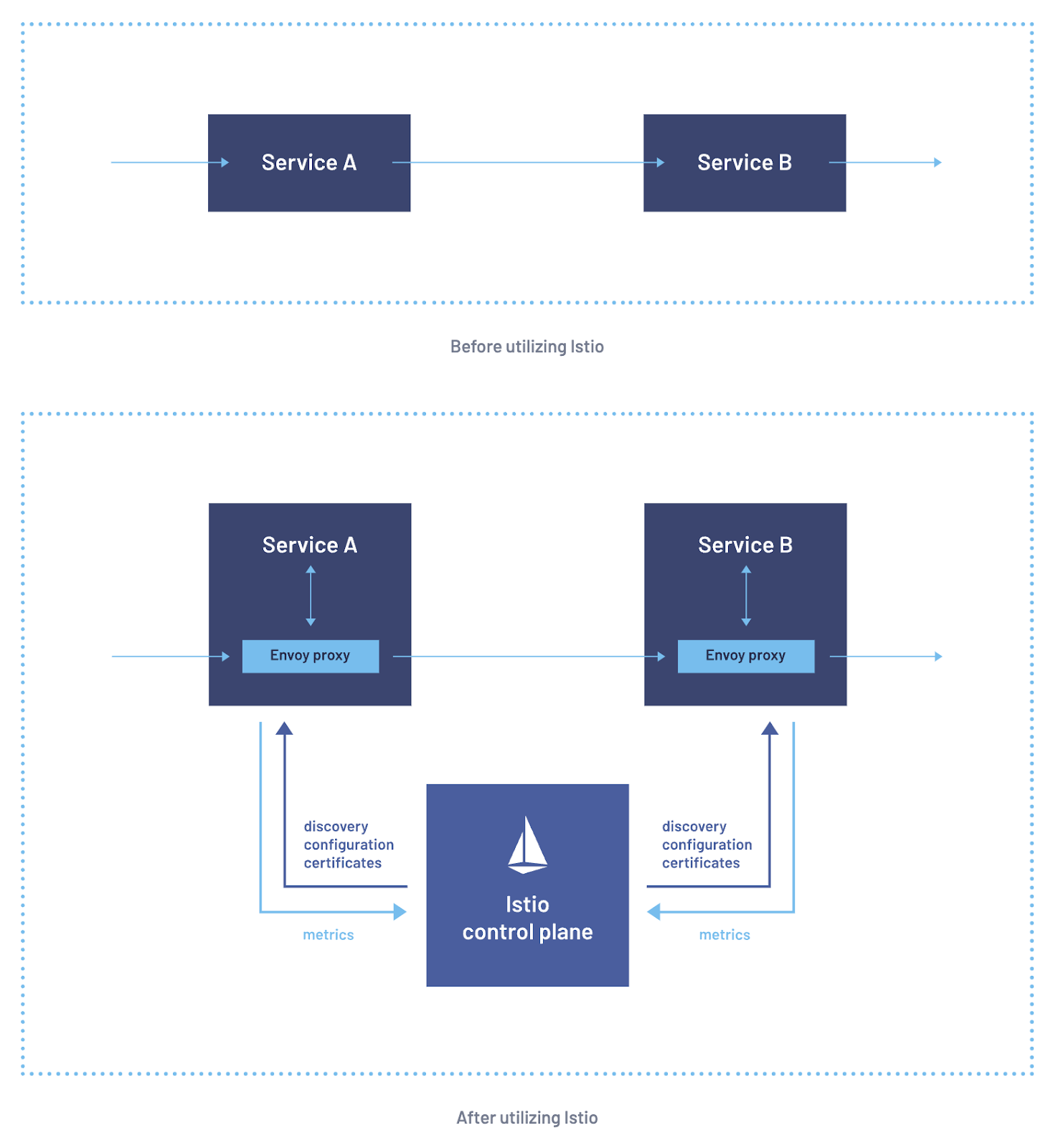 이렇게 모든 ingress / egress 트래픽이 istio-proxy를 거치게 되고 이 트래픽들은 모두 istio control plane(istiod)에 의해 접근할 수 있는 상태가 됩니다. 따라서 애플리케이션의 수정 없이 istio-proxy를 거치는 트래픽들을 모니터링함으로써 애플리케이션이 정상인지, latency는 얼마나 되는지 등의 정보를 파악할 수 있으며 (실제로 이를 사용해서 dashboard를 구성하는 application이 아래에서 살펴볼 prometheus와 grafana입니다.), 이외에 추가적인 보안설정이나 traffic management 같은 기능들도 별도의 레이어에서 구현할 수 있게 됩니다.