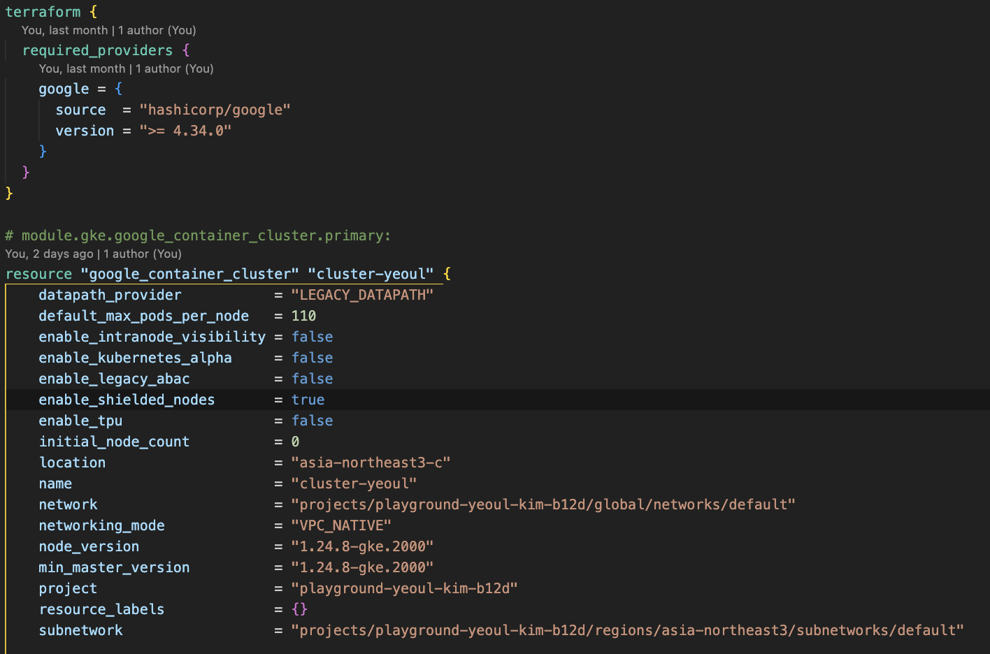 위 예제에서도 GKE Cluster의 설정을 관리하기 위해(사실은 GKE는 띄워두면 비용이 많이 들어서 편하게 띄웠다 지웠다 할 수 있도록 하기 위해서 Terraform을 썼습니다) Terraform으로 IaC(Infrastructure as a Code)를 구성하였으며, 코드는 아래와 같습니다. 로컬 환경에 클러스터를 생성하고자 하는 프로젝트의 application default 권한을 설정하고 (gcloud application default login) terraform을 설치한 뒤 terraform apply를 입력하면 아래와 같이 cluster-yeoul이라는 이름의 쿠버네티스 클러스터가 생성됩니다. (terraform에 대한 자세한 내용과 다른 기능들에 대한 내용은 공식문서를 참고해 주세요)