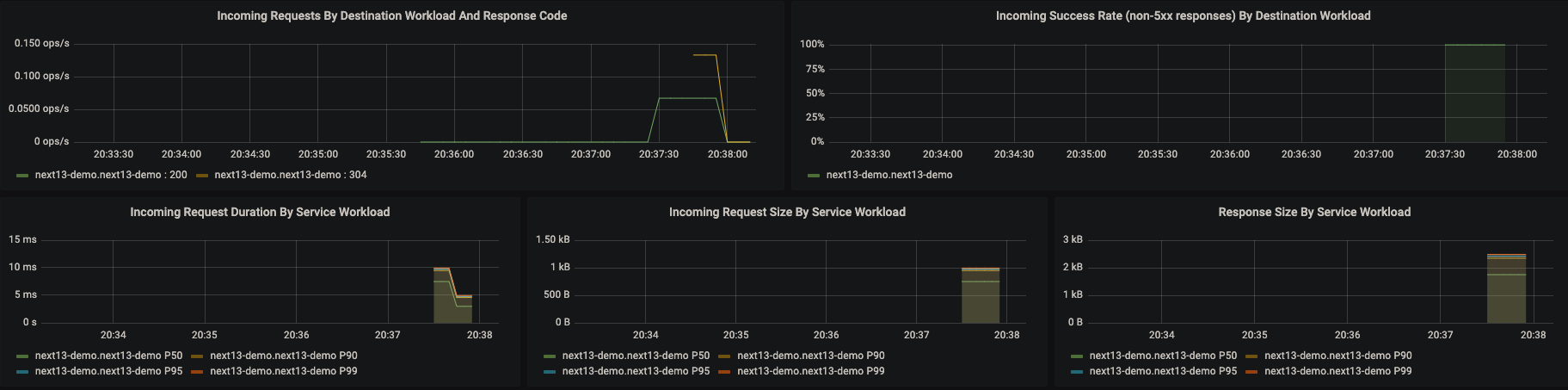 두 yaml 파일을 적용하고 나면 다음과 같이 prometheus와 grafana service가 클러스터에 추가된 것을 확인할 수 있고 grafana dashboard아 external load balancer의 형태로 외부에서 접근할 수 있게 열려 있는 것을 확인할 수 있습니다. istio-ingress에 접근하여 next13-demo 애플리케이션 페이지에 접속한 뒤 몇 번 새로 고침 해서 트래픽을 주면 다음과 같이 istio-proxy container에 들어오는 트래픽들을 Grafana에서 Dashboard의 형태로 확인할 수 있습니다.