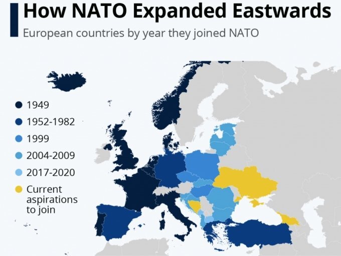 실질적으로 여겨지는 이번 전쟁의 원인은 우크라이나의 나토가입이다. 나토라는 조약기구 자체가 서유럽에서 러시아를 견제하기 위해 결성된 "군사조직"이며, 결성 이래로 지금까지 나토는 여러 서유럽 / 동유럽 국가들을 모으며 지속적으로 동진해 왔다. 강한 패권을 가지고 천하를 양분했던 소련 제국의 부활을 꿈꾸는 러시아에게 나토의 동진은 실존적인 위협(Existential Threat)이 되며, 이에 대해 러시아는 지속적으로 Red Line을 넘지 말라고 경고해 왔다.