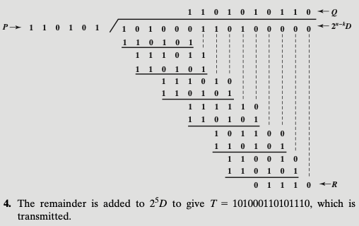 One of the most common, and one of the most powerful, error-detecting codes is the cyclic redundancy check, which can be described as follows. Given a k-bit block of bits, or message, the transmitter generates an (n - k)-bit sequence, known as a frame check sequence (FCS), such that the resulting frame, consisting of n bits, is exactly divisible by some predetermined number. The receiver then divides the incoming frame by that number and, if there is no remainder, assumes there was no error.3