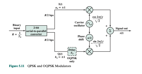 이렇게 연속된 2개의 비트를 통해 위상을 찾아내고, 해당 위상만큼 Carrier signal을 변조하는 방식을 modulation이라고 하며 QPSK modulator는 아래와 같이 생겼습니다. 이렇게 전송된 carrier signal은 수신측에서 demodulator를 통해 다시 Digital Data로 변환되는데, 이때는 해당 시그널을 특정 시간 T에 대해 적분한 후, 1이나 0으로 변환해서 얻어내게 됩니다.