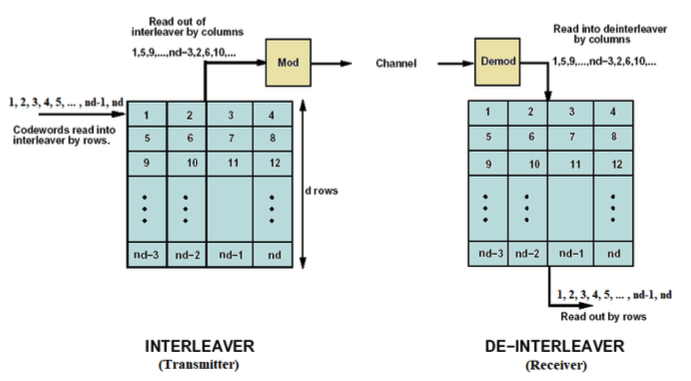 데이터를 인코딩하여 전송하다 보면 감쇠, 간섭등의 이유로 Signal Element가 손상되어 bit error가 나는 경우가 있습니다. 이를 하나의 비트만 손상되는 Single-bit error와 연속적으로 비트가 손상되는 Bust Error로 구분할 수 있는데 single-bit error의 경우 burst error에 비해 감지되기도 쉽고, FEC(Forward Error Control)에 의해 수정되기도 쉽습니다. 따라서 burst error의 경우를 최소화하기 위해 송신측에서 데이터를 전송할 때, 비트의 순서를 적절한 기준으로 섞어서 보내고 수신 측에서 이를 다시 조합하는 Interleaving 방식을 사용합니다.