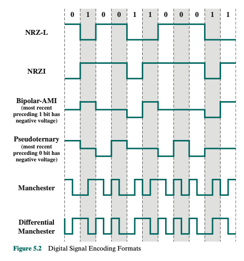 Digital Signal은 이산적인(비연속적인) 전압의 순열을 의미합니다. 여기서 전송하려는 데이터(bit)와 Signal Element를 구분해야 하는데, 하나의 데이터는 어떤 Encoding Scheme을 사용하느냐에 따라서 다양한 형태의 Signal Element로 인코딩 될 수 있습니다. 아래는 "01001100011" 이라는 데이터가 서로 다른 encoding scheme에서 어떻게 signal element로 변환되는지에 대한 예시입니다. 예를 들어 가장 간단한 방식 중 하나인 NRZ-L(Non Return to Zero - Level) 방식은 0이라는 비트를 양의 전압(positive voltage)으로, 1이라는 비트를 음의 전압(negative voltage)으로 인코딩합니다.